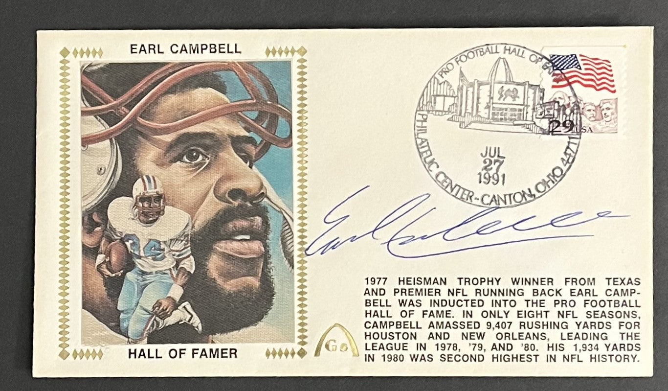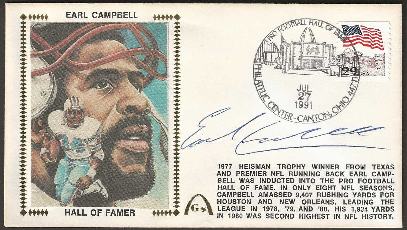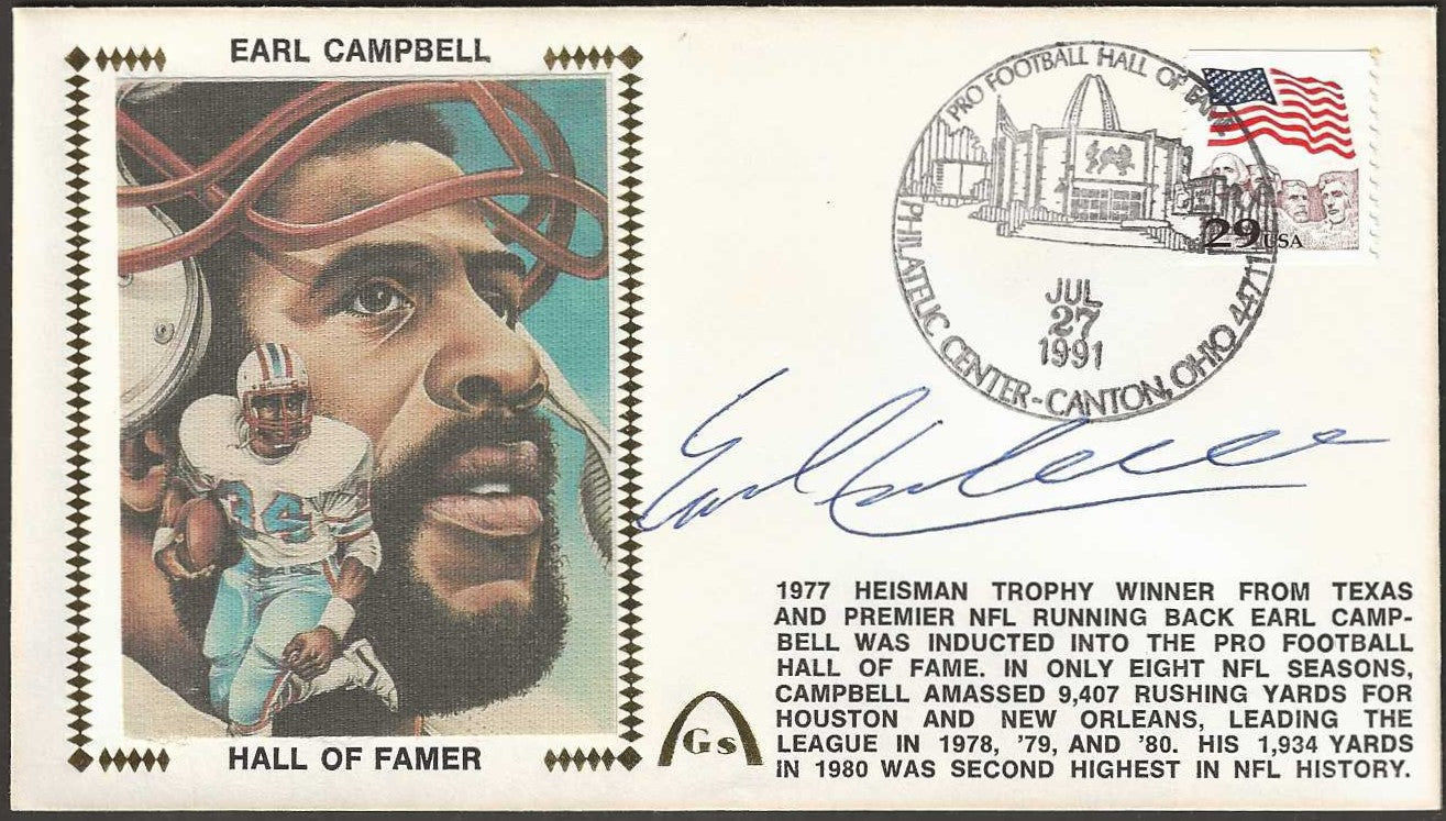 Player(s): Earl Campbell Event: Pro Football Hall of Fame Induction Ceremony Postmark: July 27, 1991 in Canton, OH Bio: Houston Oilers, New Orleans Saints, & University of Texas Longhorns